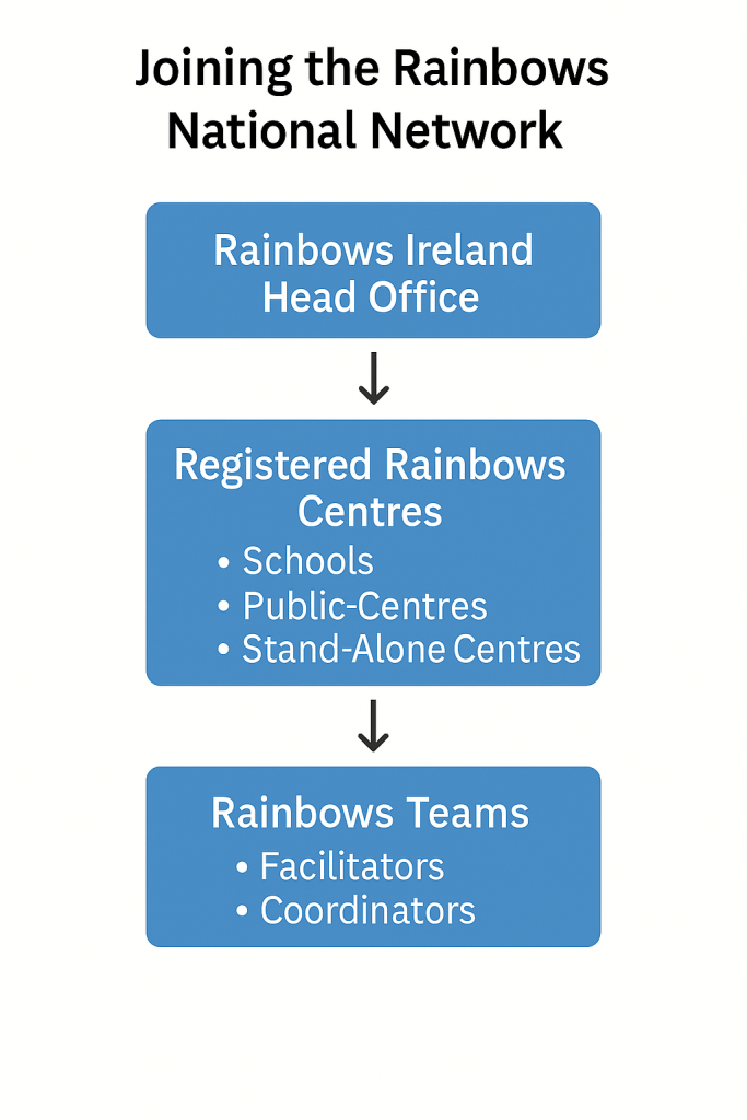 In schools and public centres, the team is typically drawn from existing staff. Training and ongoing support are provided by Rainbows Ireland.